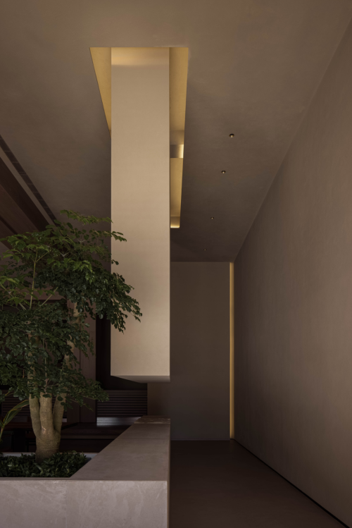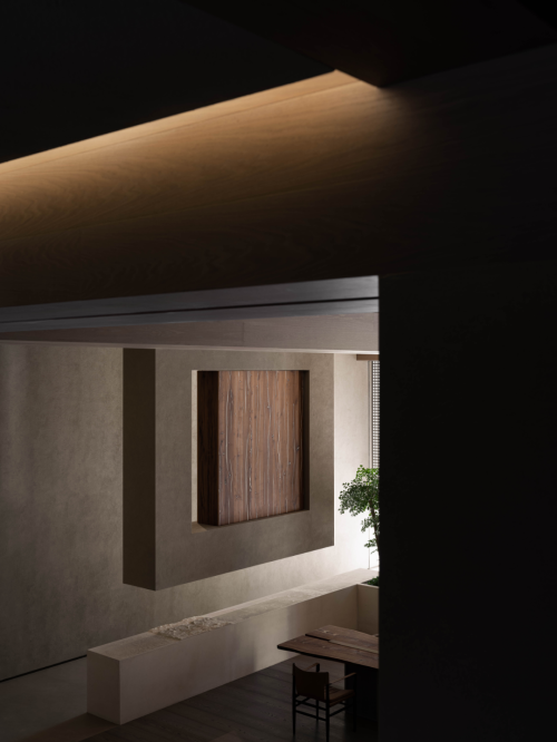 From small to large, the contact area forms an axis relationship with the long table and the display cabinet suspended on the facade. The knee high table from the corridor smoothly transits from the dumb surface to the rippling stone water surface, interspersed with the display of potted green plants and imported log surface materials. Continuity and natural meaning inject fresh vitality into the space.