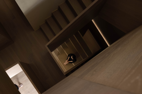 紋理突出的木作和涂料的粗糙肌理,以及不為目之所見,但確實存在的風、空氣、意韻流動于重構的錯位空間,創造“雖然感覺不到風,但水中月卻碎成了千萬片”的巧妙意境。同時木地板樓梯結構和下沉式展示區,展現了實木地板與拼花產品的更多可能。