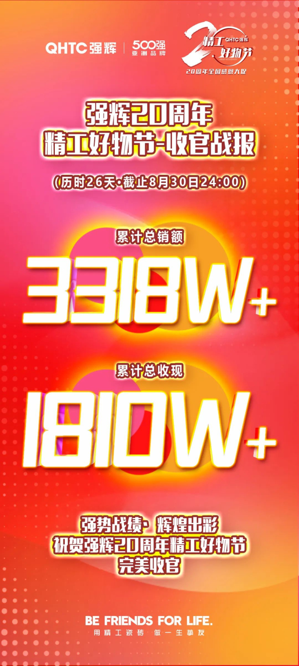 8月30日晚,強輝20周年精工好物節在強輝瓷磚佛山總部直播爆破落地,至此,為期26天的全國聯動感恩回饋活動圓滿收官!